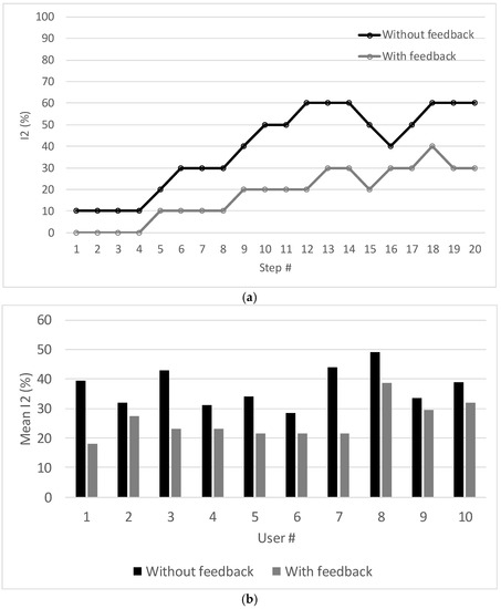 Each user was instructed to do two walks, of twenty steps each, over a straight line drawn on the floor. During the first walk the user did not receive any feedback at all; during the second walk the user received live feedback (audio) from the Spy Walker application. The feedback included the classification of the step (“good” or “bad”) and the cause of the failure (“step aborted,” “injured foot failed to move forward” or “healthy foot failed to move forward”). Figure 12a plots the risk indicator I2 for user 1 during the two walks. Similar results were found for the other users. Figure 12b presents the average value of I2, per walk, with and without feedback, for the ten users. In all cases, the motor coordination became better after the feedback given by the Spy Walker application.