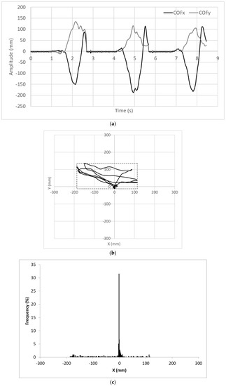Behaviour of COF during a sequence of three “good” steps: (a) COFx and COFy over time; (b) trajectory of COF over the plane; (c) histogram of COFx.