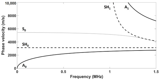 Ultrasonic guided waves are mechanical stress waves that can propagate in solid plate-like media. These waves can be grouped into two classes—namely, Lamb waves (symmetrical and antisymmetrical modes (A and S)) and SH waves. For each class, fundamental and high-order modes can exist. Fundamental modes exist at any frequency thickness product, while high-order modes appear at a specific frequency thickness product, known as the cutoff frequency thickness product [20] (p. 108). Unlike bulk ultrasonic waves in isotropic solids, the velocity of ultrasonic guided waves varies with the frequency because of dispersion. The study presented in this paper was conducted on a 1.59-mm aluminum plate, as thin aluminum structures are particularly relevant to aerospace SHM. However, the results presented in this paper could easily be adapted to other plate thicknesses or materials by using the design rules described below. Figure 1 presents the phase velocity dispersion curves in such a plate (E = 70.8 GPa, = 0.34, and = 2700 kg/m) computed using the DISPERSE software package version 2.0.20a [21]. As can be seen in Figure 1, SH is the only nondispersive guided wave mode that propagates in plate-like structures.
