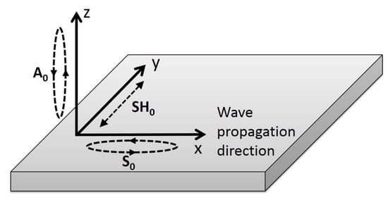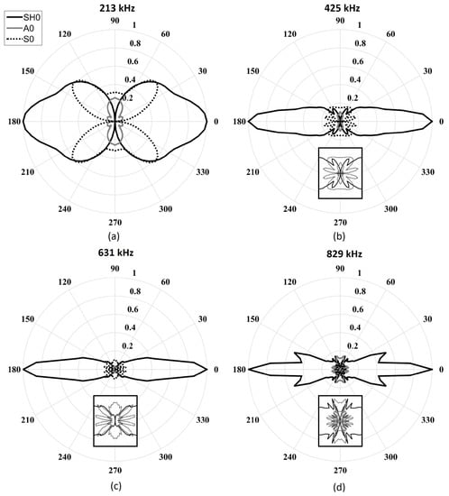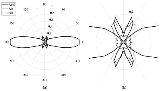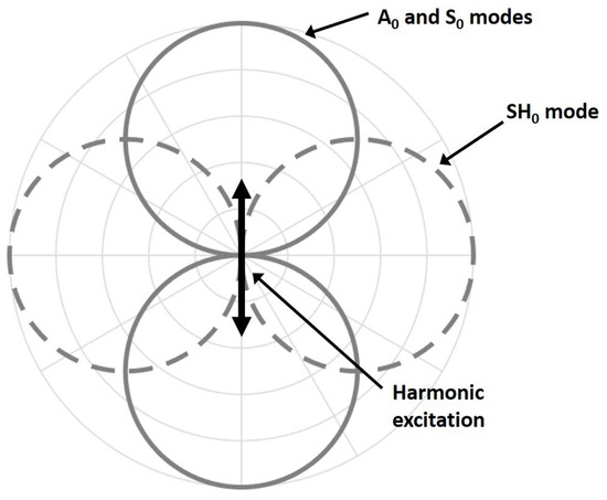 Figure 3 shows the directivity pattern of the acoustic field generated by an in-plane point source for each fundamental mode [24]. Unfortunately, as illustrated in Figure 3, the excitation required for the SH mode results in the generation of both fundamental Lamb modes in the excitation direction. Referring to Figure 2, S is approximately 6 dB higher than A for a low-frequency in-plane excitation. For such a point source excitation, the generated Lamb modes follow a dipole pattern with lobes in opposition of phases, while the SH mode also follows a dipole pattern but with lobes in-phase [25].