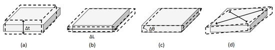 Displacement modes of a piezoelectric plate: (a) thickness-extensional displacement mode; (b) length-extensional displacement mode; (c) thickness-shear displacement mode, and (d) face-shear displacement mode.