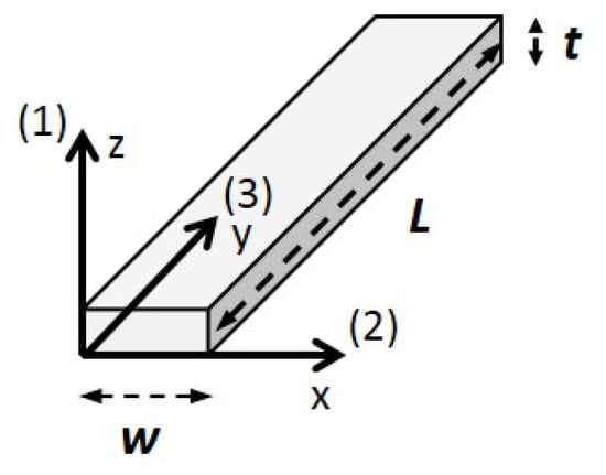 Piezoelectric conventional coordinate system used to describe the piezoelectric samples purchased from Boston Piezo-Optics. The sample is poled along the third axis, and the electrodes are on the faces normal to the first axis. Geometric parameters L, w, and t will be used as reference in this paper.