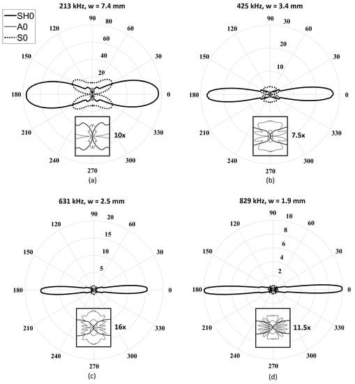 Maximum amplitude wavenumber directivity patterns of the fundamental modes obtained by finite element simulations for a fixed length (L = 25.4 mm) and fixed thickness (t = 1 mm) with a varying five-cycle Hann-windowed toneburst excitation centered at (a) 213 kHz (w = 7.4 mm); (b) 425 kHz (w = 3.7 mm); (c) 631 kHz (w = 2.5 mm); and (d) 829 kHz (w = 1.9 mm). The solid black line represents the mode, the dashed black line represents the mode, and the solid light-gray line represents the mode.