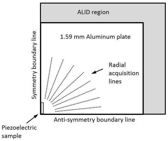 Reduced finite element scheme of a quarter plate. The symmetry boundary line is used in the Lamb modes propagation direction, while the anti-symmetry boundary line is used in the SH mode propagation direction. Absorbing layers with increasing damping (ALID) region are used to avoid reflections from edges. Data is acquired at several angles over radial lines.
