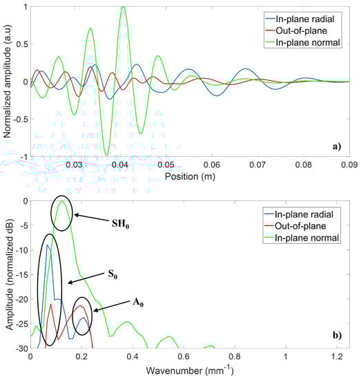 Typical (a) normalized spatial trace and (b) spatial fast Fourier transform (FFT) used to obtain the different directivity patterns in both simulation types. The blue line represents the in-plane radial displacement component (mainly associated with the mode), the red line represents the out-of-plane displacement component (mainly associated with the mode), and the green line represents the in-plane normal displacement component (exclusively associated with the mode).
