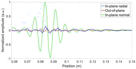 Typical normalized experimental spatial trace used to obtain the directivity pattern based on modes wavenumber maximum amplitude using spatial FFT. The blue line represents the in-plane radial displacement component (mainly associated with the mode), the red line represents the out-of-plane displacement component (mainly associated with the mode), and the green line represents the in-plane normal displacement component (exclusively associated with the mode).