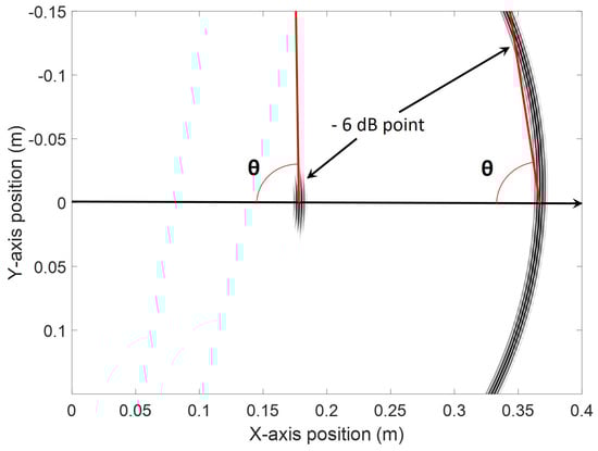 Schematic of how the 6 dB wavefront angle with respect to the propagation direction was calculated. As an illustration, the SH mode was used at two different times of propagation and for two different transducer geometries at a constant frequency.