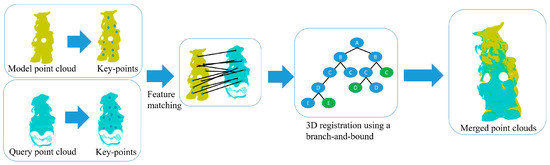 Branch-and-bound approaches guarantee the global optimality of the solution; however, the branch-and-bound algorithm can sometimes be very slow since it requires an intensive computational cost that grows exponentially with the data and problem size. Briales and Gonzalez-Jimenez [30] proposed solving the 3D registration problem with global optimality guarantees, where Lagrangian duality theory is exploited for convex tight relaxation. Zhou et al. [31] presented a robust optimization method for a feature-based registration that used a scaled Geman–McClure estimator as a cost metric in the optimization procedure to cope with incorrect correspondences. Their method showed faster and more robust performance that ICP and Go-ICP. However, this algorithm generally tends to degrade in terms of accuracy when a set of correspondences have a high fraction that are incorrect. In addition, Poreba et al. [32] presented a RANSAC-based algorithm that used line-to-line correspondences to estimate the initial transformation, and Lu et al. [2] developed a coarse-to-fine feature-matching algorithm with multi-scale local features for recognizing a specific object in 3D point clouds.