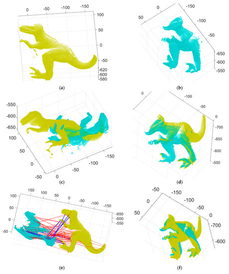 Figure 2, Figure 3 and Figure 4 show the two input range images of a T-Rex object and the 3D Euclidean registration results obtained using the five different methods. Figure 2a,b depict the two 2.5D range data of a T-Rex object from the University of Western Australia (UWA) range image database [37,38]. They were densely scanned with the Minolta Vivid 910 scanner to get 2.5D range images of two different directions. From the detected 3D features in the two range images, 85 putative point-to-point correspondences were established, as shown in Figure 2e. Figure 2c shows the initial pose of the input data of Figure 2a,b. Figure 2d,e show range images aligned, and the correct and incorrect matches classified by our MaxFS-based branch-and-bound, where the blue and red lines denote an inlier and an outlier, respectively. ICP has often been used to refine the registration results obtained by performing the coarse registration. Figure 2f shows the refined registration obtained by applying the ICP to Figure 2d. Figure 2g shows the convergence of the global lower and upper bounds of our branch-and-bound. As shown in Figure 2g, the gap between the two bounds is relatively large in the initial search stage of our branch-and-bound. Nevertheless, the gap decrease as the iteration count increases. The global lower and upper bounds converge after 634 iterations; moreover, 78 outliers and seven inliers were found from the 85 putative correspondences. Figure 2h presents the number of active nodes in the branch-and-bound search tree at each iteration step, indicating the proposed algorithm’s memory usage. Figure 2i shows the remaining volume of the quaternion parameter space as the proposed algorithm converges.
