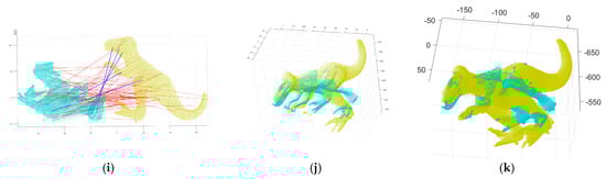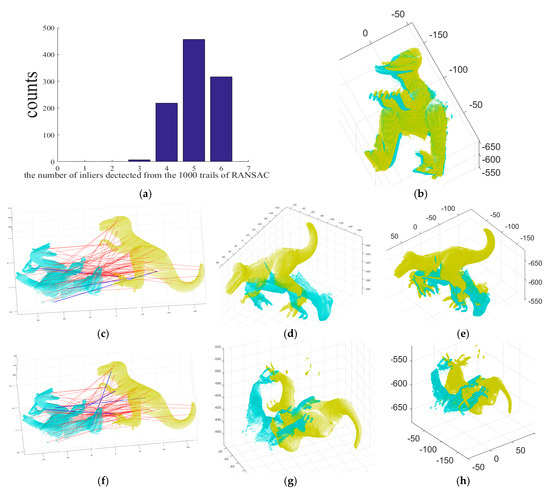 Figure 3 shows the registration results achieved by the absolute orientation algorithm [15], with RANSAC, on the inputs of Figure 2a,b. This RANSAC-based method was tested with 1000 RANSAC trials and the maximum number of iterations was set to 10,000 for all trials. Figure 3a shows the histogram of obtained inliers, ranging from three to six. Although RANSAC is a well-established means of finding inliers, its results are not consistent, and it did not find all of the inliers. Figure 3b shows the refined registration obtained by applying the ICP to range images aligned with the six inliers detected by the RANSAC-based method. Figure 3c–k show some failure cases that are aligned with the 3, 4, and 5 inliers detected by the RANSAC. Figure 3c,f,i show the correct and incorrect matches detected by the RANSAC-based method, shown by blue and red lines, respectively. Figure 3d,g,j show the point clouds aligned with the 3, 4, and 5 inliers detected in Figure 3c,f,i, respectively. Figure 3e,h,k show the refined registration obtained by applying the ICP to Figure 3d,g,j, respectively.