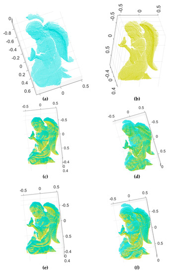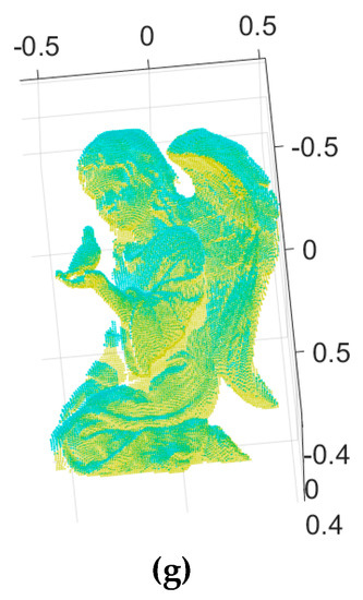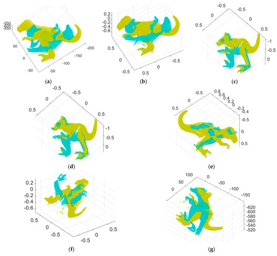 3D registration results for the dense registration algorithms: (a) range images aligned by ICP [7] for Figure 2a,b, (b) range images aligned by globally optimal (Go)-ICP [24], (c–f) range images aligned by trimmed Go-ICP, with respective trimming percentages of 20%, 30%, 50%, and 80%, (g) registration result by fast global registration [31].