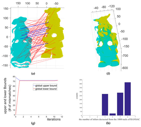 Figure 5 shows the two input range images of a chef object and the 3D Euclidean registration results obtained using the three different methods. Figure 5a,b depict the two 2.5D range data of a chef object from the UWA range image database. Figure 5c shows the initial pose of the input data of Figure 5a,b. Figure 5d shows the range images aligned by the ICP algorithm. From the detected 3D features in the two range images, 78 putative point-to-point correspondences were established, as shown in Figure 5e. Figure 5e shows the correct and incorrect matches classified by our MaxFS-based branch-and-bound, shown by blue and red lines, respectively, Figure 5f shows range images aligned by our MaxFS-based branch-and-bound, and Figure 5g shows the convergence of the global lower and upper bounds of our MaxFS-based branch-and-bound. The global lower and upper bounds converge after 11 iterations, as shown in Figure 5g, and 72 outliers and six inliers were found from the 78 putative correspondences. Figure 5h shows the histogram of obtained inliers, ranging from three to six, where the RANSAC-based method was tested with 1000 RANSAC trials and the maximum number of iterations was set to 10,000 for all trials. We performed the experiments on the Go-ICP, trimmed Go-ICP, and fast global registration using the publicly available codes provided by the original authors. The running times for ICP, fast global registration [31], and RANSAC were 3.263 s, 6.109 s, and 54.087 s for a pair of the T-Rex range images, respectively. It required more than a day to obtain each result of Go-ICP and trimmed Go-ICP, as shown in Figure 4b,f. The computation time of our method was 2.102 h and 9 min 16 s for the pairs of the T-Rex and chef range images, respectively.