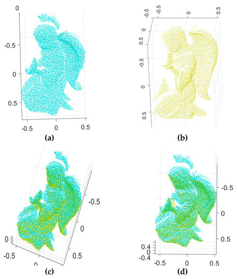 The focus of this paper is pairwise registration. The iterative closest point (ICP) algorithm is widely employed for registering pairwise dense 3D data sets in an alternating, iterative manner. A transformation is estimated that minimizes the Euclidean distances between the pairs of closest points, in the least squares sense, by alternating between (1) building closest-point correspondences under the current transformation, and (2) estimating the transformation with current correspondences until convergence. The L2 error metric defined in ICP corresponds to the maximum likelihood estimate of transformation when the matching noise between two point clouds is Gaussian [7]. Chanpleboux et al. [8] discussed the problems caused by the small overlap between two point clouds and the initial estimate parameters being too far from the true solution. Given the data scanned from one part of an object and the corresponding data from a different side of the same object, the distance minimization produces the wrong estimate because non-overlapped points are treated as outliers in the ICP process. The main limitation of ICP is that it requires a preprocessing procedure of rough alignment between two point clouds because it is sensitive to the initial conditions and easily trapped in local minima, owing to the optimization’s non-convexity. Nevertheless, ICP and its variants are very popular and have been applied in numerous real-world settings due to their simplicity and ease of use. In addition, several variants of the original ICP have been proposed to improve robustness and deal with outliers [9,10,11]. Trimmed ICP, which employs the least trimmed squares for an error metric instead of least squares defined in the ICP, is robust to outliers and mismeasurements. When the overlap of two point clouds is more than 50%, this method is applicable because the least trimmed squares metric has a breakdown point of 50%. Levenberg–Marquardt (LM) ICP was introduced to improve robustness to the poor initialization of estimate parameters, optimizing the error metric with the LM algorithm instead of the linear least square method [11].
