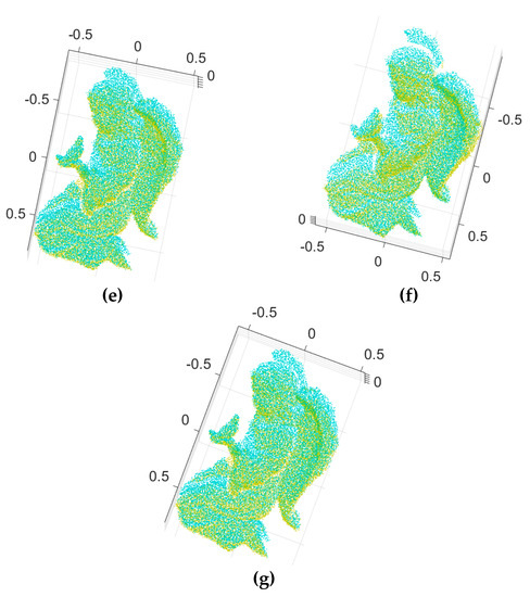 To validate the robustness of our algorithm with respect to the Gaussian noise, we carried out experiments using synthetic range data that included the ground truth value and synthetic range data obtained from [39]. Figure 6 shows the two input range images of an angel object and the 3D Euclidean registration results obtained using the proposed method and others. Figure 6a,b depict the two 2.5D synthetic range data. Figure 6c–e show range images aligned by Go-ICP, trimmed Go-ICP, and fast global registration, respectively. Figure 6f shows range images aligned by our branch-and-bound and Figure 6g shows the refined registration obtained by applying the ICP to Figure 6f. Moreover, Figure 7 shows the two input range data with added Gaussian noise (σ = 0.0025, where σ is the standard deviation of the Gaussian distribution) of an angel object and the 3D Euclidean registration results obtained using the proposed method and others.