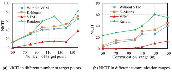 We use the number of inter-cluster interference targets (NICIT) to assess the reliability of the deployment and efficacy of the VFM. Figure 5a shows the NICIT curve resulting from four strategies (without VFM, KM, or RP) with n targets (such that n = 100) and with various communication radii from 50 to 100 m. The NICIT increases after the targets are added, and RP yields the worst effects. VFM provides the best performance, particularly if R is less than 140. When R is more than 90 m, the NICIT greatly increases for the remaining methods, except for VFM. The NICIT for R = 150 m, with different methods, is the number of target points from 50 to 150, as shown in Figure 5b. Generally, all NICIT values rise when n is added, as a result of more target points increasing the probability of inter-clutter interference. Similarly, VFM produces the best performance in terms of NICIT. Relative to KM, without VFM and RP, VFM reduces the NICIT values by 93%, 94%, and 94%, respectively. Moreover, our proposal can decrease the inter-cluster interference and increase the reliability of the IMWNs. Since our algorithm adopts the virtual force and motion on cluster heads to reduce inter-cluster interference, the presented strategy always obtains the lowest NICIT compared with other methods.