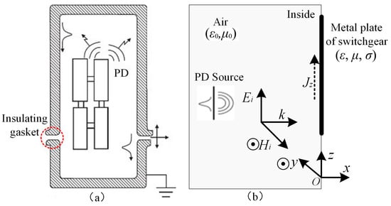 Principle of TEV signal coupling: (a) Propagation of PD EM waves; (b) generation of transient earth voltage (ε0: permittivity of air; μ0: magnetic conductivity of air; Hi: magnetic field intensity of incident electromagnetic wave; Ei: electric field component of incident electromagnetic wave; ε: permittivity of metal plate; μ: magnetic conductivity of metal plate; σ: conductivity of metal plate; k: direction of electromagnetic wave propagation; and Jz: induced current density in conductor).
