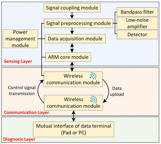 The wireless TEV detection system consists of respective sensing, communication, and diagnosis layers, as shown in Figure 2. The sensing layer is composed of the WSN. Every sensing unit consists of several basic modules—specifically, a TEV signal coupling module, signal preprocessing module, data acquisition module, wireless communication module, power management module, and ARM core. The selected ARM core module in this study is the STM32f205_64pin (STMicroelectronics, Geneva, Switzerland) with the basic frequency of 120 MHz and 64K RAM. The wireless TEV sensors are used to detect the PD signal and operation state of the switchgear. The communication layer is connected to the sensing layer and the diagnosis layer. The distributed sensors upload the monitoring data to the diagnosis layer regularly; the diagnosis layer transmits the control command or monitoring strategy to the distributed sensors. In addition, the sensing layer only uploads abnormal warning messages to the diagnosis layer after detecting abnormalities, which avoids reporting redundant data and consumes less power. There are two main functions regarding the diagnosis layer. First of all, the uploaded abnormal data is analyzed and diagnosed. In addition, this layer can also determine a dynamic monitoring strategy to automatically adjust the time interval of monitoring according to the current operation and load status of switchgear.