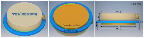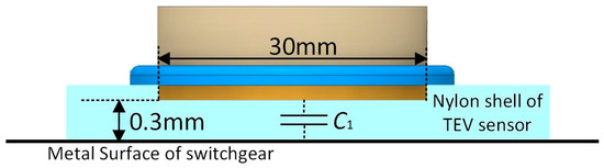 The specific process of parameter determination is as follows. Firstly, the value of C2 and C3 are set to 1 pF and 100 pF, respectively. Then, as it is previously mentioned, the value of capacitance C1, which is the equivalent geometric capacitance between the metal surface of the switchgear and the TEV coupling module, should be as bigger as possible than C2. The shell of TEV sensor is made from nylon, whose relative dielectric constant is 4.1 and the thickness of the dielectric layer is 0.3 mm. In addition, considering the volume of the sensor, the diameter of the circular metal surface is 30 mm, as shown in Figure 4.