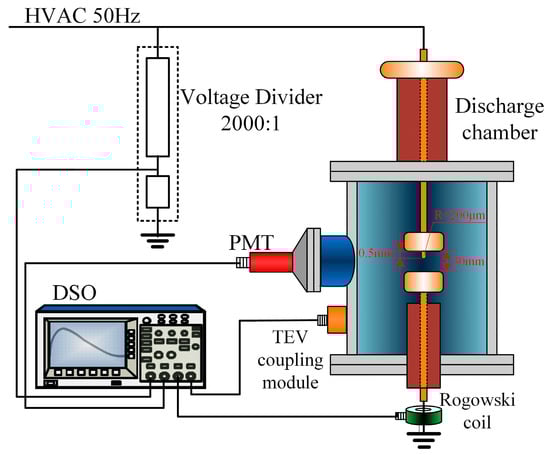 In order to verify the performance of the TEV coupling module, a PD detection experimental switchgear system with metal protrusion defect was devised, as shown in Figure 6. A stabilized power frequency HV supply was connected to the plate electrode via a water resistor (500 kΩ). The designed TEV module was attached on the surface of discharge chamber to couple the PD signal. In addition, the experimental system also introduced a photomultiplier tube (PMT, HAMAMATSU, R7600U-01, Shizuoka, Japan) for the photon radiation intensity detection and Rogowski coil for the pulse current signal in the discharge process. Finally, signals from voltage divider (2000:1), a Rogowski coil and PMT were fed to a digital oscilloscope (LECROY, 64MXs-B, New York, NY, USA) with an analogue bandwidth of 600 MHz and 10 Gs/s sampling rate.