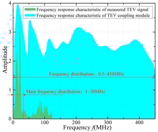 Figure 7 shows the measured TEV signal under the applied voltage of 11.5 kV in air, which has the feature of oscillating attenuation. The duration of the TEV signal is approximately 0.6 µs and, according to Figure 8, its main frequency spectrum ranges from 1 MHz to nearly 30 MHz, which is also set as the upper cut-off frequency of the filter circuit in the ensuing sections. Using a spectrum analyzer (GWINSTEK, GSP-930, New Taipei City, Taiwan) with 9 kHz–3 GHz bandwidth and the frequency resolution of 1 Hz, the frequency response of the TEV coupling module was obtained (see Figure 8). The spectrum distribution range is almost up to 450 MHz, which contains the frequency components of the PD signal.