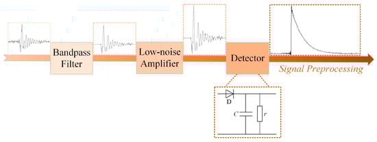 The TEV signal preprocessing procedure is shown in Figure 9 and its corresponding circuit consists of a bandpass filter, low-noise amplifier, and detector. The original high-frequency signal coupled by TEV coupling module is filtered and amplified, then it is converted into low-frequency double-exponential signal via the designed detector, which includes three main components: diode (D), capacitor (C), and resistor (r). The technical principle of detector is that when the amplitude of signal is larger than the forward voltage of diode D, the diode D is turned on and its on-resistance is recorded as r’. As long as the time constants of charging (τ1 = r’C) is far less than that of discharging (τ2 = rC), the capacitor C can be charged fast and discharge to resistor r slowly.
