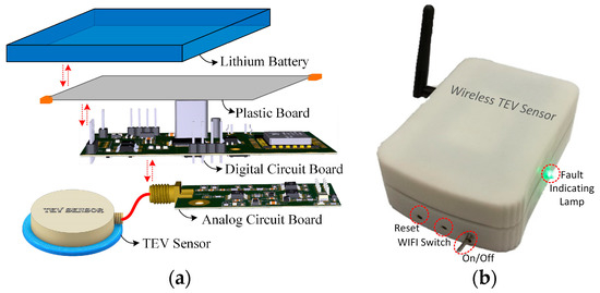 Wireless TEV sensor: (a) structural design diagram; and (b) physical picture.