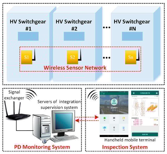 Based on the wireless distributed TEV sensor, an intelligent detection system and application strategy in the field, which combine the advantages of live testing and online testing, was developed. The construction of the TEV WSN and its corresponding topological graph is shown in Figure 14 and Figure 15, respectively. In general, the entire monitoring system consists of TEV WSN, signal exchanger, servers of the integration supervision system, and a handheld mobile terminal. In addition, the PD detection strategy includes two parts: the PD monitoring system and inspection system. For the PD monitoring system, when all of the MV/HV switchgear is operating normally, the sensing units regularly upload the characteristic data according to the preset monitoring density, for example, twice per day. When the test data are abnormal, the system increases the monitoring density, even changing into the real-time monitoring mode automatically, and sends the status information to the terminal server and operation and maintenance personnel. In terms of the inspection system, when it is time for the regular inspection of the HV switchgear or a switchgear failure warning occurs, the operation and maintenance personnel can carry the handheld mobile terminal to the switchgear room for further diagnosis onsite. Considering the complex EM interference onsite, a direct transmission model is adopted as the topological structure of the WSN to guarantee the stability and reliability of the entire system.