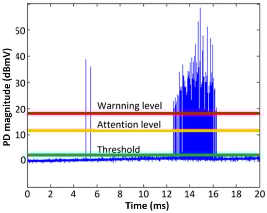 In order to reduce data transmission and data redundancy, and increase the adaptability of the sensing network, the sensor unit needs to have primary diagnosis ability, including background noise estimation and historical trend analysis. Figure 16 shows an example of the three levels determined by the sensor unit in primary diagnosis—specifically, triggering threshold, attention level, and warning level—which is decided by the decision layer according to the empirical value, background noise level, and historical trend. The in situ status is recorded by the sensor unit for historical analysis. Only if the PD level exceeds the attention level are the full sampled data uploaded to the host PC.
