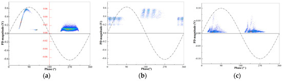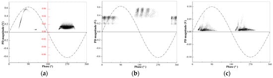 PRPD diagram of switchgear typical insulation defects: (a) needle-plate discharge caused by metal protrusion; (b) floating potential discharge caused by bad electrical contacts; and (c) surface discharge due to pollution of the insulator or metal particle on the insulator surface.