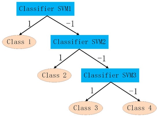 As a classification method based on structural risk minimization principle, a support vector machine (SVM) [25,26] is adopted to conduct PD pattern recognition of abnormal switchgear in this paper. Using non-linear mapping, the SVM maps input vectors to a high-dimensional feature space and approximates the objective function with optimal hyperplane. In addition, it has good generalization ability and can be used to solve the calculation of high-dimensional space well. For PD pattern recognition, the SVM needs to be extended to a multi-classifier [27]. Therefore, the construction of the SVM with a binary tree is designed to recognize four kinds of discharge patterns, as shown in Figure 19. The SVM classifier output values are ‘1’ and ‘−1’, respectively.