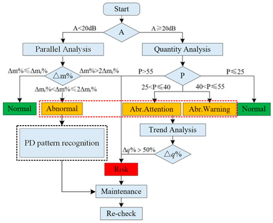 On completion of the in situ status diagnosis in the sensing layer, the PD activity and the status information are uploaded into the diagnosis layer. Quantity analysis, trend analysis, parallel analysis, and PD pattern recognition are utilized in this process and a deterministic diagnosis result is provided for risk assessment. The detailed diagnosis procedure is shown in the Figure 21.