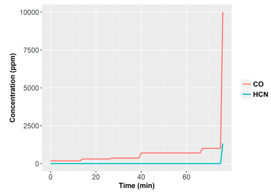As example of smoldering fire and the release of volatiles, we can refer to a series of NIST tests fires performed with armchairs made of polyurethane foam with cotton fabrics [40,41]. The total mass was 5.7 kg, and the total volume of the room was 12 m3. The fire was initiated with two cigarettes placed over the chair. In this particular test, the fire run in smoldering conditions for 1 h before developing a flame. Figure 1, Figure 2 and Figure 3 show the progress of combustion products. We can observe how CO concentration builds up slowly in the room while the HCN presence only starts when flame conditions occur (Figure 1). On the other hand, O2 concentration also remains constant at 21% and lowers drastically only with the presence of open fire. Finally, the CO2 concentration increases slowly and finally it grows fast also in the case of open fire (Figure 2). We should remark that lethal conditions are attained due to the build-up of toxicants in the smoldering phase before flames appear. The Fractional Effective Dose reaches FED = 1 before the flame appears and before CO, HCN and CO2 concentration rise (Figure 3).
