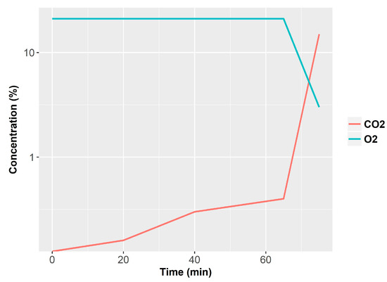 Example of the time evolution of O2 and CO2 during a smoldering fire [40].