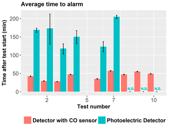 Time to alarm in smoldering fires in the SP Fire Research Experiment. Comparison between photoelectric detectors and multisensory including CO Electrochemical Cell [42]. Photoelectric detector combined with CO sensor always produced faster alarm signals, and it was able to detect all the test fires. Standalone photoelectric detector did not trigger the alarm for three of the fires (not detected [N.D.]). Experiment #5 was not considered in the study as the fire developed to open fire.