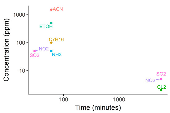 Sulphur dioxide (SO2) is an irritant gas. It may appear in the combustion of some textiles like wood or viscose [20], but also rubber materials. Mathematical models of lethal toxicity of fire smoke consider sulphur dioxide a key component [21]. Sulphur dioxide has been detected in real overhaul operations in concentrations of around 2 ppm, with maximum values of 8.7 ppm.