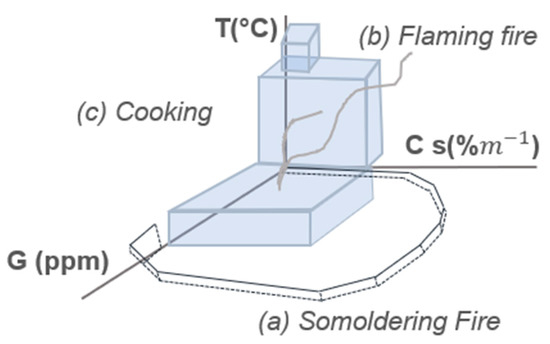 Briefly, smoke detectors can be considered as particle detectors that are sensitive to a specific distribution of particle sizes. Usually, fire alarm is triggered when the sensor signal reaches an established threshold. As a result, these systems struggle in discriminating particles resulting from fires and non-combustion particles when the particles have similar size or refractive indices. For example, smoke detectors also show sensitivity to water vapor and dust [13]. Moreover, they cannot distinguish combustion products from a fire threat condition from combustion products produced under controlled conditions, such as cigarette smoke or some cooking activities [14].
