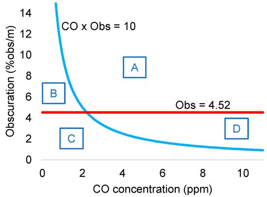 where COHb is in %, CO in ppmv, respiratory minute volume (RMV) in L/min and t in min. With these units B = 3.32 × 10−5. The CO concentration that is accumulated in the blood in the form of COHb determines the effects on the subject. First symptoms in humans (headache) are reported when COHb reaches values of about 10%, after the subjects were exposed to 15,000 ppm of CO for 2 min, or 30,000 ppm for one minute. Time to incapacitation depends on the accumulated CO and also on the physical activity of the subject. For example, at 10,000 ppm of CO, probable time to incapacitation for humans was estimated at 10 min, 4 min, or 1 min for resting state, light work, or slow running, respectively. Additionally, it is interesting to remark that the half recovery time for adults at rest is 320 min [31,32].
