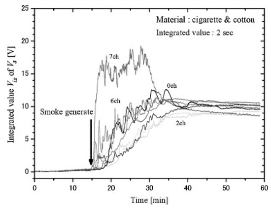 - Sawada, A.; Higashino, T.; Oyabu, T.; Takei, Y.; Nanto, H.; Toko, K. Gas sensor characteristics for smoldering fire caused by a cigarette smoke. Sens. Actuators B Chem. 2008, 130, 88–93. [Google Scholar] [CrossRef]