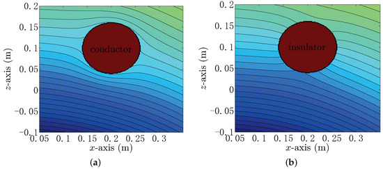 (a) An example of the potential distribution distorted by the spherical metallic target; (b) an example of the potential distribution distorted by the spherical insulator target.