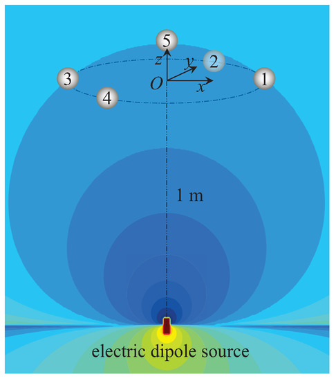 To further verify the effectiveness of proposed localization method, a simulation model is implemented in a commercial electromagnetic simulator environment, the Computer Simulation Technology (CST) Studio Suite. By using CST, the uncertainties in a practical environment such as position error of the electrodes, the boundary effect of the water tank and position error of the target can be neglected, which would give us more objective and credible results. In this simulation model, we restructure the spherical target and UCA system in Section 3. The observation area is filled with the seawater material whose conductivity is S/m. Four spherical PEC electrodes are situated at , , and , respectively, and one spherical PEC electrode is located at as the reference point. The radius of the five spherical PEC electrodes is 1 mm. Two electrodes with a radius of 1 mm are set at and as the emitters of the UCA system. The distortion of the field by the electrodes can be neglected because the volume is small enough. We load the source excitation of 50 A on the two electrodes, resulting in a dipole moment of 1 A·m. The spherical PEC target with a radius of m is located in the observation area. The simulation model is shown in Figure 11.