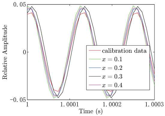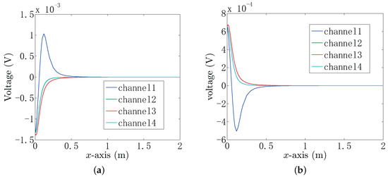 When the target is located near the UCA system, the voltage of each channel of the UCA system can be obtained. Figure 3a shows the obtained voltage of each channel when the conductor target is set at position . Figure 3b shows the obtained voltage when the insulator target is set at position . From Figure 3, it can be seen that the voltage amplitude in Channel 1 has a different property from the other three channels. That is because the distance between the target and Electrode 1 decreases as x increases when , and it increases when . Electrodes 2 and 4 are symmetric about the x-axis, yielding that Channels 2 and 4 have the same voltage curves when the target is located on the x-axis. The voltage of each channel contains the position information of the target, which allows the electric-locator to estimate the target position based on the BEM and MP-MUSIC algorithm.