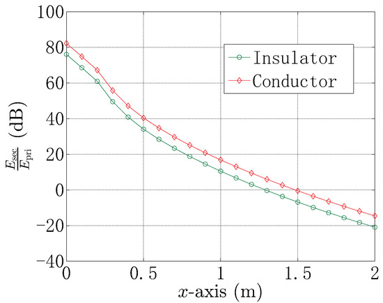 The proposed UCA system can reduce the influence of the electric dipole source. Figure 4 shows the comparison between the magnitude of the primary energy generated by the emitter and the secondary energy reflected by the spherical target . From Figure 4, it can be seen that plays the main role when m for the conductor target and m for the insulator target, where the contribution of can be neglected. However, for the conductor target, the will not be neglected, when the target lies in m. For the insulator target, the will not be neglected, when the target lies in m. In the practical scenario, the reference point is close to, but not at the equipotential point, which causes the primary energy not to be zero. Moreover, the secondary energy will decrease as the target gets far from the UCA, which results in the decrease of the ratio of , where:
