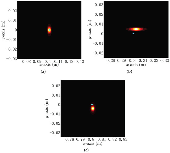 According to the measured voltage obtained from each channel of the proposed UCA system, the spectrum can be obtained, with which the electro-locator can estimate the position of the target. The additive white Gaussian noise is added to all measured voltage data, where the squared Frobenius norm of the noiseless signal matrix is one hundred times that of the squared Frobenius norm of the noise matrix . As a result, the signal-to-noise ratio (SNR) is 20 dB [29,30]. Figure 5 gives the spectrum images of an insulator with the radius of m when it is situated at points m, m and m, respectively. The real position of the target is marked with a blue point, and the highlighted spots in the spectrum images indicate the estimated positions of the target. The peaks of the spectrum images are m, m and m, which are the estimated positions by the use of the proposed electro-locator. The corresponding location errors are m, m and m, which shows that the proposed locating method can be applied in underwater target locating. Next, we will study the locating performance in detail.
