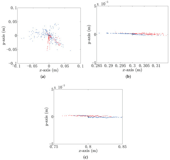 The 200-times independent locating operation by using the BEM model and the simplified model with dB. The black cross indicates the real position of the target. (a) The estimated position of the conductor target whose true localization is m; (b) the estimated position of the conductor target whose true localization is m; (c) the estimated position of the conductor target whose true localization is m.