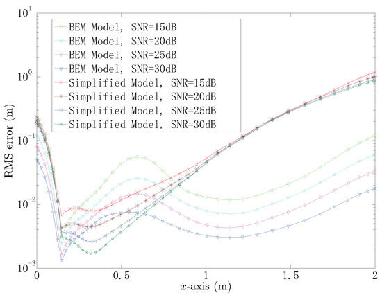 In order to evaluate the accuracy of the proposed localization method when the target is situated at the continuous positions , the RMS errors of the estimated position by using the simplified model and BEM model at the same SNR are given and compared in Figure 8 and Table 2. For the simplified model, the RMS error curves are close to the others when and , which means that the RMS errors would not decrease obviously as the SNR increases. The RMS errors decrease significantly as the SNR increases by using the BEM model. Furthermore, the BEM model provides more accurate estimation of the position compared with the simplified model with the same SNR when and . It should be noted that the simplified model shows good locating performance when . For example, when the target is located at , the RMS errors are m and m by using the simplified model at 15 dB and 30 dB, respectively; whereas the RMS errors are m and m by using the BEM model.