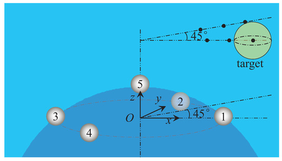 In this section, we present a numerical example and a simulation model to illustrate the features of our proposed localization method. The conductivity of the locating area is , which is the same as the seawater. A UCA system is designed, which consists of two parts. The first part is the emitter, which is an ideal electric dipole source. The electric dipole source is situated at m with the dipole moment along the z-axis. The second part is the receptor, which is the ideal points in this simulation model. The electrodes positions in the UCA system are listed in Table 1 and shown in Figure 2. The electrodes Index Numbers 1–4 are uniformly distributed on a circle of radius m, and the fifth electrode is set as the reference electrode. We define the output data of channel k as the voltage between the k-th electrode and the reference electrode, . Additionally, the five electrodes are set at the equipotential points of the electric dipole source, which means that the voltage from channel k should be zero when there is no target in the observation area. Then, a spherical target with a radius of m is discretized into 3004 triangular patches. In this locating system, we hold the number of time samples constant at 200 for one locating operation, yielding in (40).
