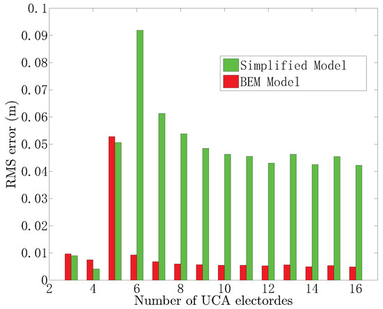 In this paper, the receptor of the UCA system consists of five electrodes, yielding four measurement channels. Theoretically, the reference point and points on the circle l: are of the same potential, where . We investigate the locating performance of the UCA system with Q electrodes uniformly distributed on the circle , . Figure 10 shows the RMS of the estimated position versus the number of electrodes by using the simplified model and BEM model, when the target is situated at with dB. From Figure 10, we found that increasing the number of electrodes will not improve the locating accuracy significantly. It is obvious that the simplified model provides lower RMS errors compared with the BEM model when and 5. However, the RMS errors are large when the number of electrodes , and the RMS errors are about m. The simplified model provides the best locating performance when the number of electrodes is four. For the BEM model, the RMS errors are stable as the number of electrodes increases when and . The BEM model shows the worst locating accuracy when the number of electrodes is taken as five and the RMS error is greater than m. Thus, according to Figure 10, the optimal number of electrodes in the UCA system for the BEM model and the simplified model is four.