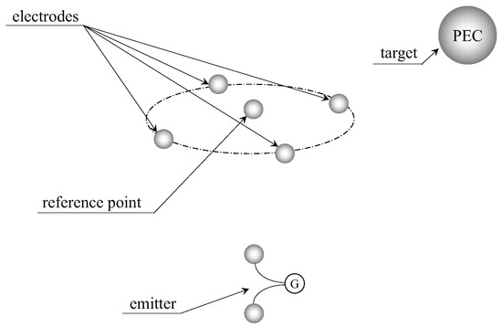 In this perspective, in [12], the authors set up an experiment by using four-point electrodes that are placed at the apexes of a rhombus in a rigid moving frame driven by a robot. In this system, two electrodes that are situated at the opposite apexes of the lozenge are polarized in voltage and play the role of the electric organ of discharge, while the other two opposite electrodes play the role of receivers. Rasnow [13] first applied a small sphere perturbation formula in a uniform electric field, which is still very popular in the latest electro-location literature [10,14,15,16]. However, in this theoretical model, the field near the target should be a uniform electric field, which means that the radius of spherical targets should be small. Thus, the surrounding field performs as the uniform electric field. In the works [17], an artificial electrosensory array was designed to study the feasibility in underwater robots. The artificial electrosensory array was able to estimate the position of a plastic sphere with a diameter of 10 mm, when the plastic sphere was 12 mm away from the electrosensory array. Their distance estimation algorithm was realized based on the spatial distribution of the sensor measurements [18]. In Lebastard’s work [3,19], a bio-inspired method has been proposed to improve the localization performance on the basis of the unscented Kalman filter. In Peng’s work [20], a finite element model (FEM) of underwater an active electrolocation system based on the coupling Cole–Cole model and Maxwell theory was built. However, in both Lebastard’s and Peng’s electro-location systems, the electrosensory array needs to move and measure the electric field while locating the target, which is not suitable for positioning a dangerous target in practice. In the work [21], a MUSIC-type algorithm is proposed for locating small inclusions buried in a half-space by means of measuring the scattering amplitude at a fixed frequency in two-dimensional space. The locating method is based on far area theory. However, far area theory is not suitable for underwater target locating because the high frequency radiation wave cannot be transferred a long distance.