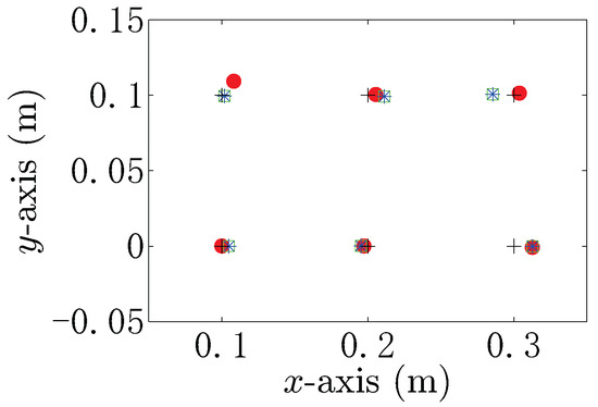 The estimated positions and their actual positions are also given in Table 5, and we can find that the maximum location error is m for the conductor target and m for the insulator target. However, the location errors of the other points are less than m. The estimation errors may be due to the following reasons. Firstly, the electric dipole source in the UCA system is not an ideal dipole, which has physical dimension errors in practice. Secondly, the frame of the UCA system can affect the distribution of the electric field. Thirdly, the electrodes’ position deviations are introduced to build the UCA system, resulting in locating errors. Finally, the actual positions of the target and the UCA system may be slightly moved during measurement because of the water wave. Although some experimental results slightly offset the center position, the localization accuracy is still good. These results prove that the proposed localization scheme can be applied to underwater target locating.