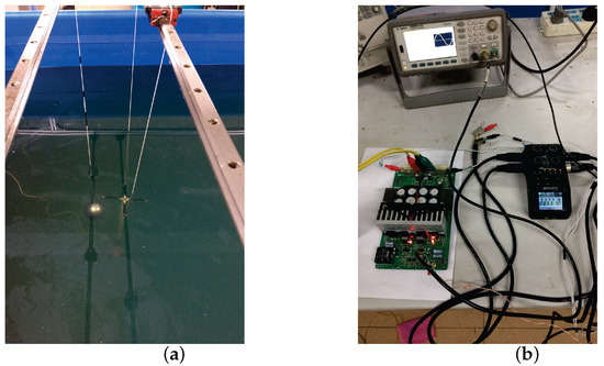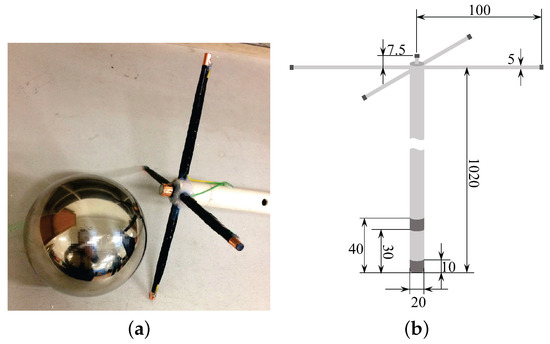 In order to further verify the effectiveness of the proposed locating method in reality, a set of physical experiments is developed in our laboratory environment. We create a UCA system with 5 electrodes and an electric dipole source. The image of the UCA system and the detailed sizes are shown in Figure 13. A cylindrical plastic pipe is used as the frame of the UCA system, with a diameter of 20 mm. Two metal sheets cover the end of the cylindrical plastic pipe to act as the electrodes of the dipole source. Four plastic cylinders with diameters of 5 mm and lengths of 100 mm are fixed at the other end of the frame. The four plastic cylinders are set at the same plane, which is perpendicular to the frame. Four metal sheets cover the end of the plastic cylinders as the receiving electrodes. The fifth electrode or the reference electrode is situated at the top end of the frame, which is mm from the plane of the four receiving electrodes. In Figure 14, the UCA system is vertically set at the center of the water tank, the electric dipole source of which is powered by a high power amplifier. The 5 electrodes compose the four-channel receiver, which are connected to a voltage measurement device product, the ZOOM H6 Handy Recorder. The measured data in the ZOOM H6 Handy Recorder will be imported into the MATLAB calculator. Then, the calculator outputs the estimated result of the target. The depth of the water in the tank is m, and the conductivity of the water is set to be 4 S/m, which is close to the conductivity of sea water. A spherical target with a diameter of 100 mm is mounted on a horizontal movable gantry workbench with a size of 3 m by m, which allows us to move the target along the pre-programmed trail with high geometric resolution.